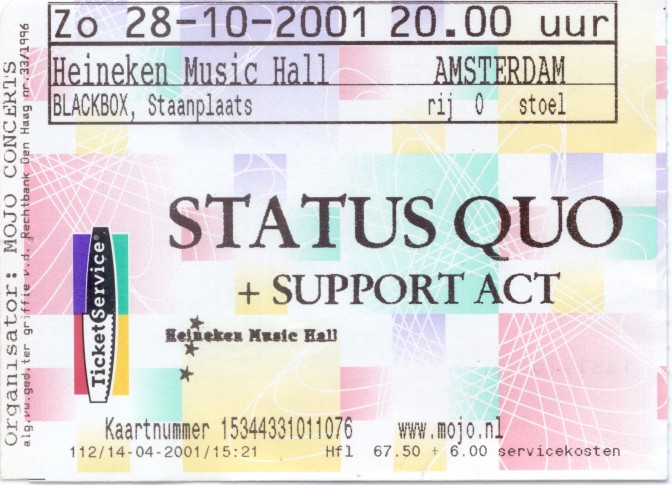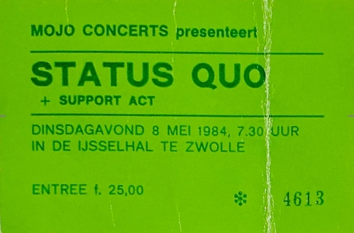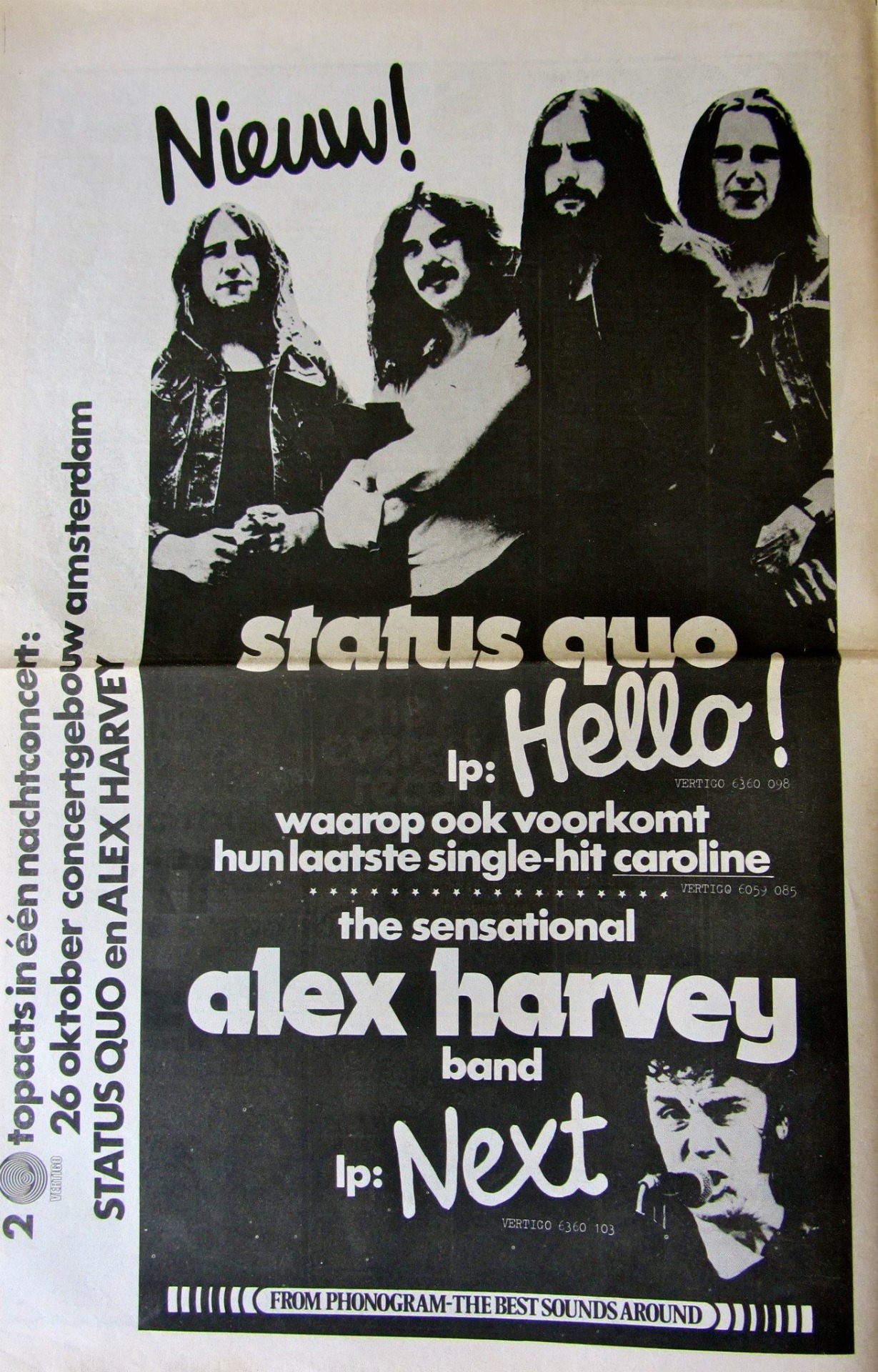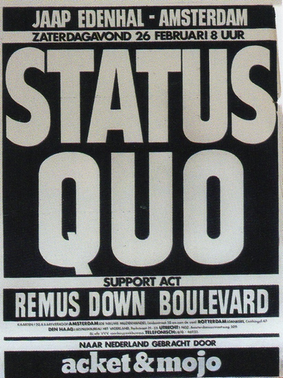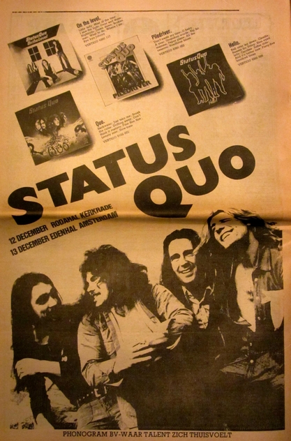 Lorsque les 5 jeunes musiciens débarquent aux Pays-Bas, en août 1968, pour 4 concerts au Pays-Bas, ils sont, certainement très loin de se douter du fantastique succès qu'ils y rencontreront, tout au long des années suivantes et pendant toute l'existence de la formation. En effet, pas moins de 80 concerts seront distillés dans le pays. Parallèlement, Status Quo sera l'un des groupes étrangers les plus vendeurs de disques. 32 singles occuperont les Charts, pendant 199 semaines (près de 4 années !!!) alors que 35 albums y seront, également, classés pendant 187 semaines. Au passage, sept disques d'or seront recueillis. Après le Royaume-Uni, l'Allemagne et la France, les Pays-Bas représenteront le 4ième marché pour le groupe.